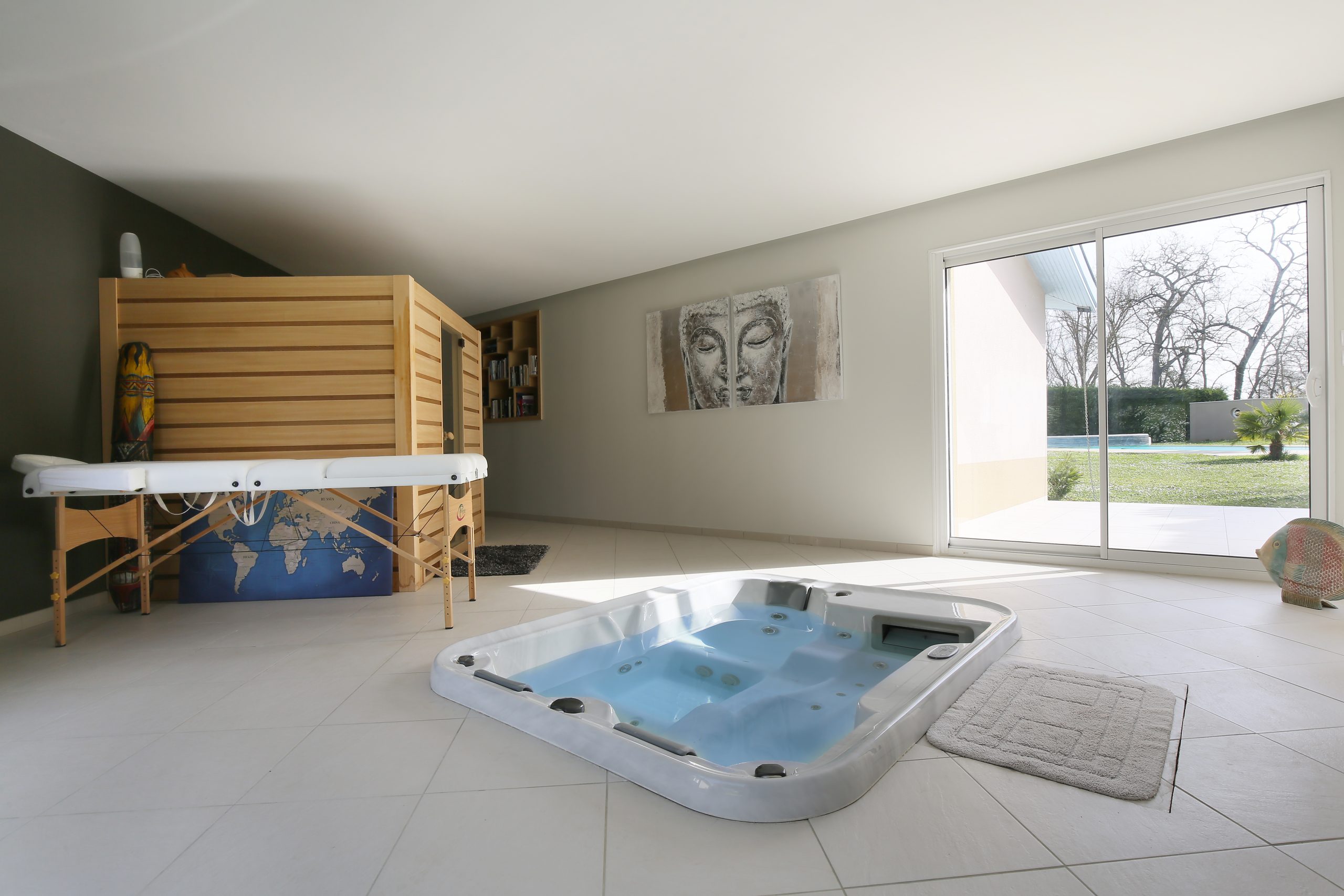 A relaxation area of about 32 m2 with sauna and jacuzzi overlooking the outside, a gym and a very large garage.